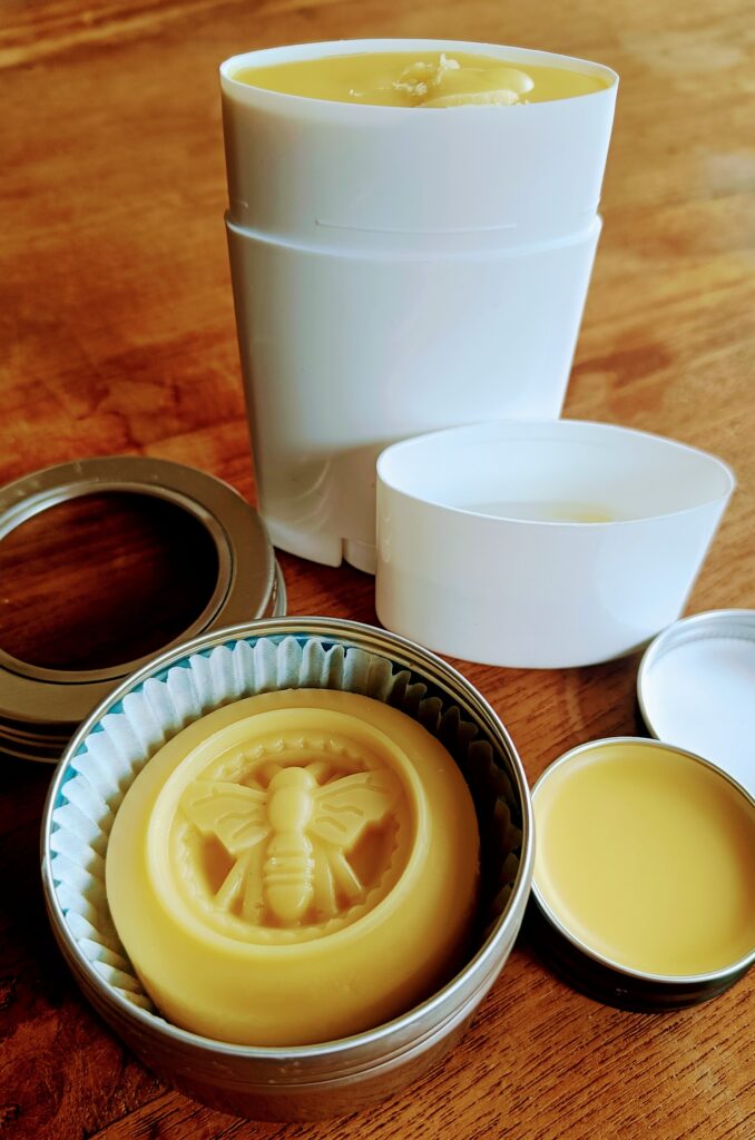 Maar zoals het vaak gaat, als je iets graag wilt komt er vanzelf een oplossing op je pad. Deze keer in de persoon van Leontien Zethof-Jannink. Zij is de eigenaresse van Uzepia en gaf, net toen ik verlegen zat om iemand die me verder kon helpen, een workshop bijenwas cosmetica op onze vereniging. Wat een leuke ochtend was dat! Bij binnenkomst stond al een volledig ingericht werkstation voor elke deelnemer klaar. Alle attributen en ingrediënten die je maar nodig kunt hebben en een uitgebreide handleiding stonden tot onze beschikking. Voordat we aan de slag ging nam Leontien eerst de handleiding uitgebreid met ons door, zodat we wisten wat ons te wachten en te doen stond. Daarna gingen we zelf aan de slag. En zowaar, aan het einde van de workshop had ik een lippenbalsem, een bodylotionbar en een deostick gemaakt!